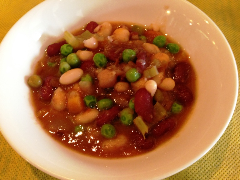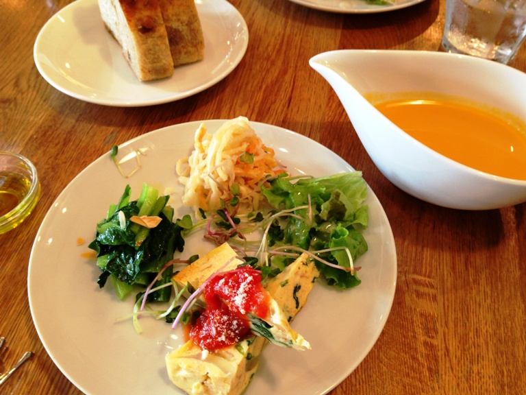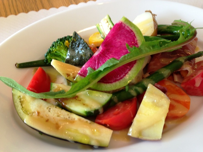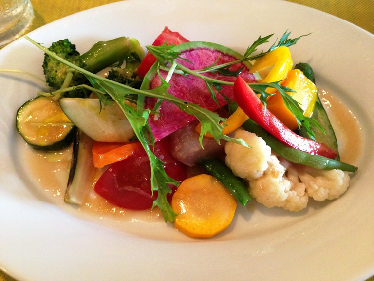 最初に お豆のスープ。次に紅芯大根など めずらしい野菜を使った