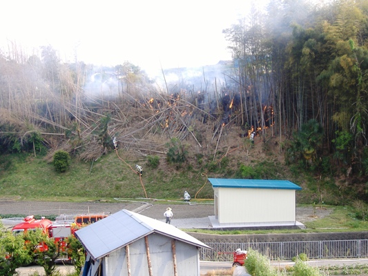 と 音が・・・びっくりして 窓の外をみると 竹林から 真っ赤な炎があがってました・・・