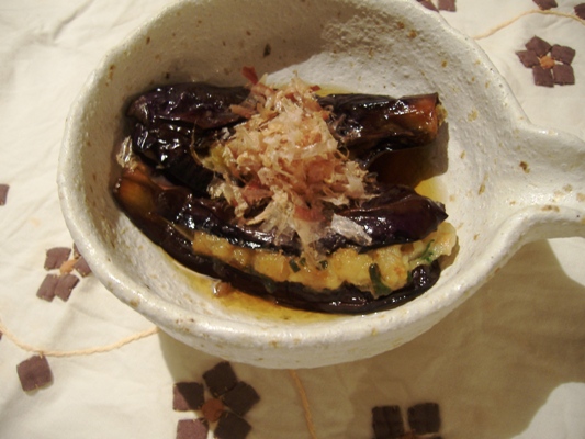 お茄子に 海老をたたいたのをつめて 揚げて おだしをかけました・・・・